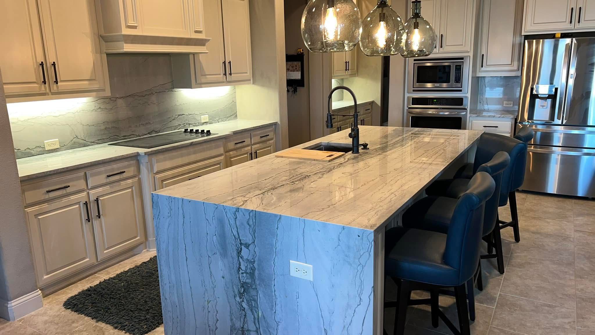 Custom quartz and granite countertops for spacious kitchens. Precision-crafted surfaces designed to deliver smooth curves, clean lines, and a seamless fit.